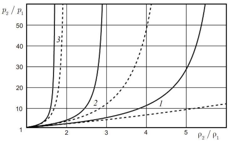 На рис. 2 приведены зависимости для ударной адиабаты и изоэнтропы при γ = 1.4. Видно, что по мере увеличения максимальная степень сжатия газа уменьшается.