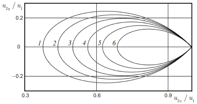 Рис. 4. Диаграмма скоростей для косого скачка уплотнения газа АН: 1) – ; 2) – ; 3) – ; 4) – ; 5) – ; 6) –