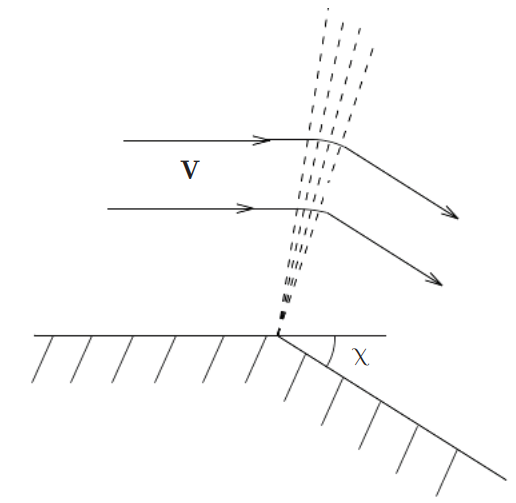 Используя (3.1) и (3.2) и учитывая, что , находим угол поворота потока χ за скачком уплотнения, рис. 1: