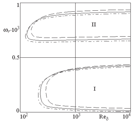 Рис. 2. Кривые нейтральной устойчивости временных возмущений двумерных мод I и II