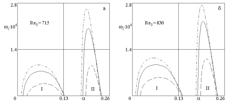 На рис. 3 приведены кривые ωi(α) инкрементов временных возмущений, полученные для областей неустойчивости мод I и II для чисел Рейнольдса Reδ = 715 и 830 соответственно. Можно констатировать, что источник вблизи поверхности приводит к относительно небольшому возрастанию в пределах 20% максимальных значений инкрементов обеих мод. В то время как при верхнем положении источника максимумы инкрементов понижаются более, чем вдвое.