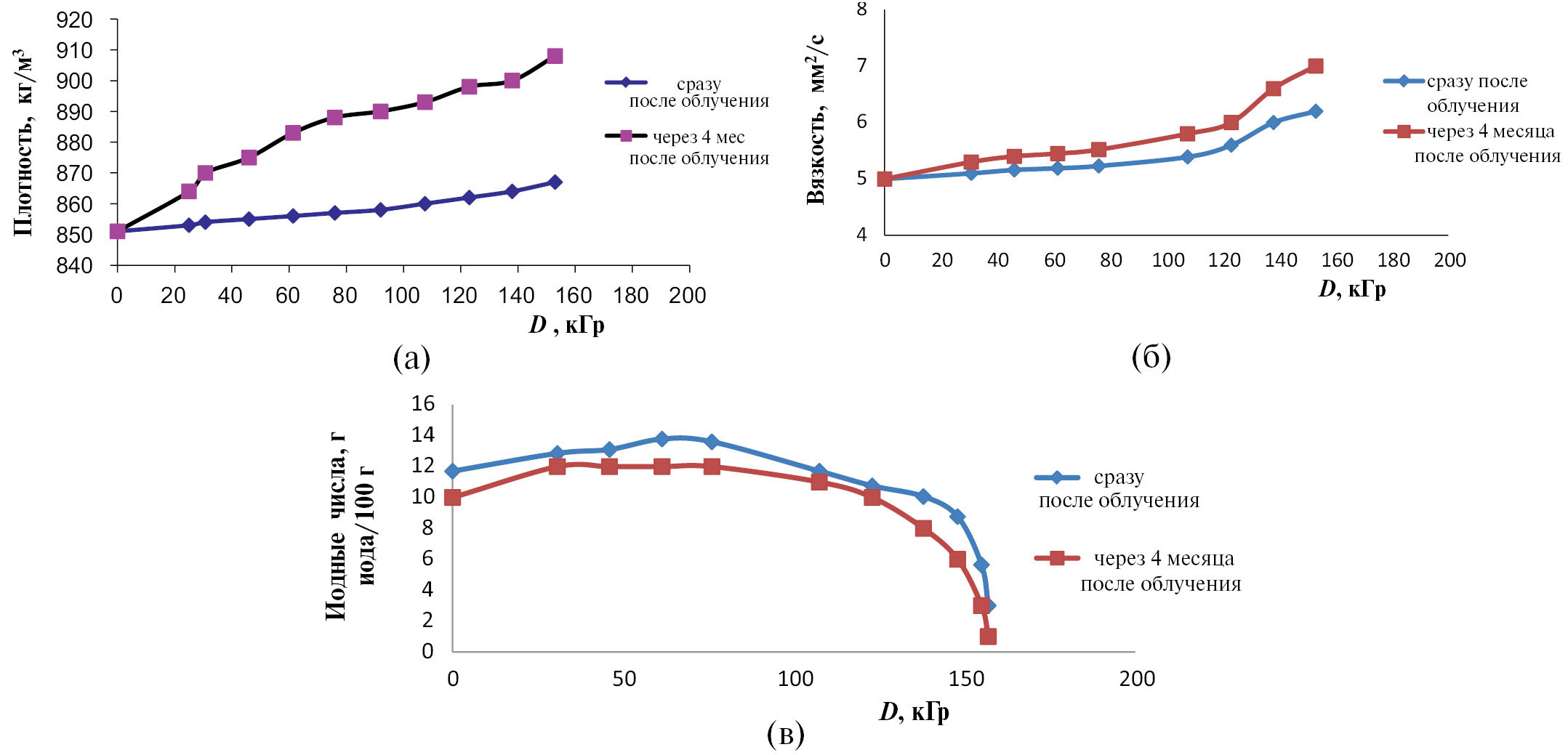 Рис. 1. Изменения плотности (а), вязкости (б) и иодных чисел (в) ДТ сразу после облучения и через 4 месяца спустя после облучения при различных поглощенных дозах. Т = 20°С, Р = 0.07 Гр/с.