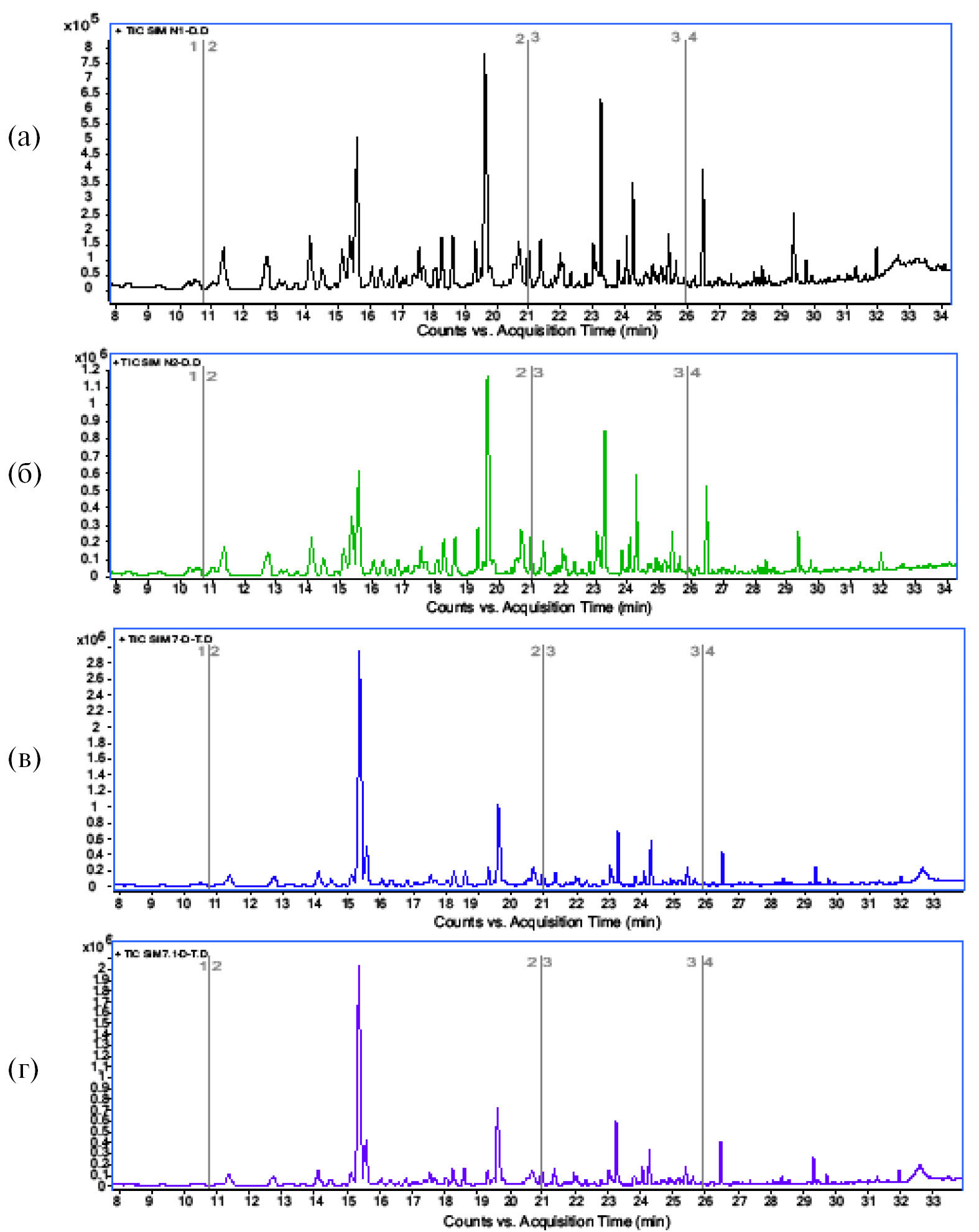 Рис. 4. Хроматограммы смеси дизтопливо–толуол при концентрации толуола 1%: а – N1-Rad0, исходное дизтопливо; б – N2-Rad, облученное дизтопливо; в – N37.1-Rad0 – необлученное дизтопливо с толуолом; г – N47.1-Rad – облученное дизтопливо с 1% толуола.