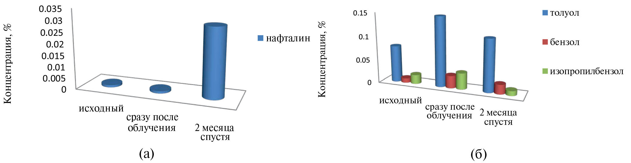 Пострадиационные изменения компонентов ДТ представлены в табл. 2–4 и на рис. 5. Спустя 2 месяца после облучения концентрация нафталина в ДТ увеличивается в 18 раз, бензола – в 2 раза. Эти результаты можно объяснить разрывом и образованием связей в результате воздействия облучения.