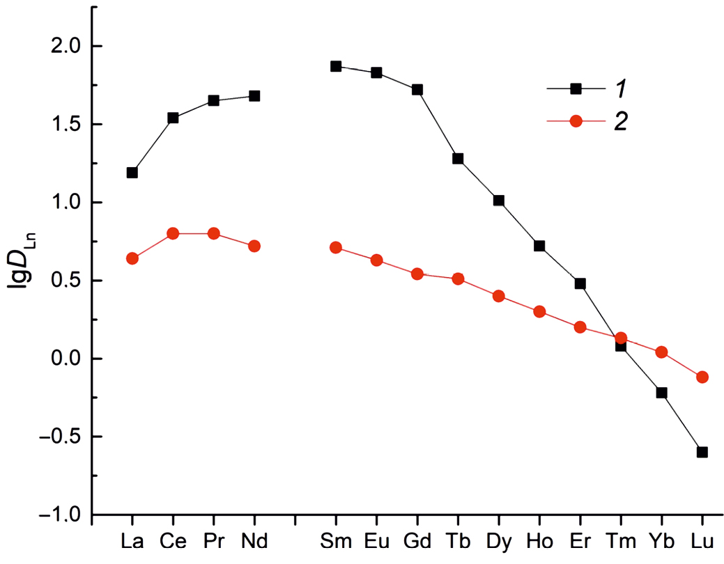 Содержание Ln(III), U(VI) и Th(IV) в исходных и равновесных водных растворах определяли методом масс-спектрометрии с ионизацией пробы в индуктивно связанной плазме с использованием масс-спектрометра XSeries 2 (Thermo Scientific, США). Содержание элементов в органической фазе определяли по разнице концентраций в водном растворе до и после экстракции. Коэффициенты распределения элементов (D) рассчитывали как отношение их концентраций в равновесных фазах. Погрешность определения D не превышала 10%.