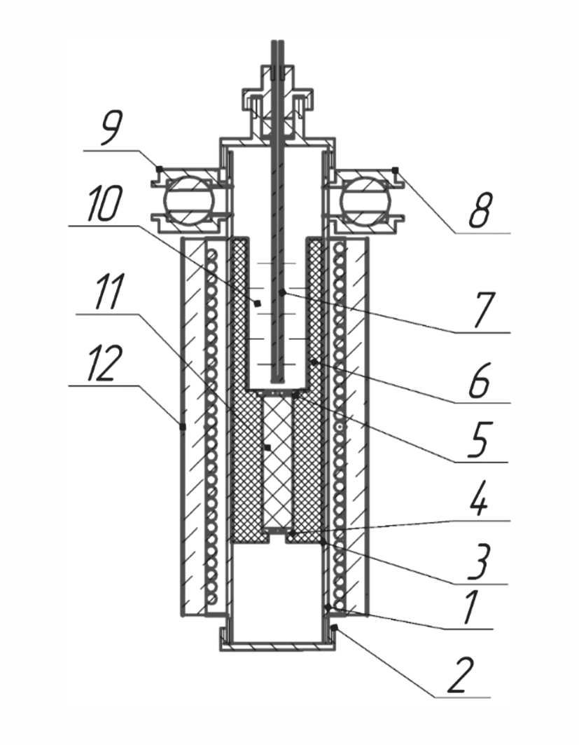 Рис. 1. – Схема установки по динамики сорбции в расплаве фторидов солей. 1 – стальной внешний корпус, 2 – нижняя крышка реактора, 3 – графитовая колба, 4 – нижняя фильера, 5 – верхняя фильера, 6 – емкость расплава, 7 – оболочка термопары, 8 – кран подачи инертного газа, 9 – кран откачки воздуха, 10 – расплав, 11 – сорбент, 12 – нагреватель.