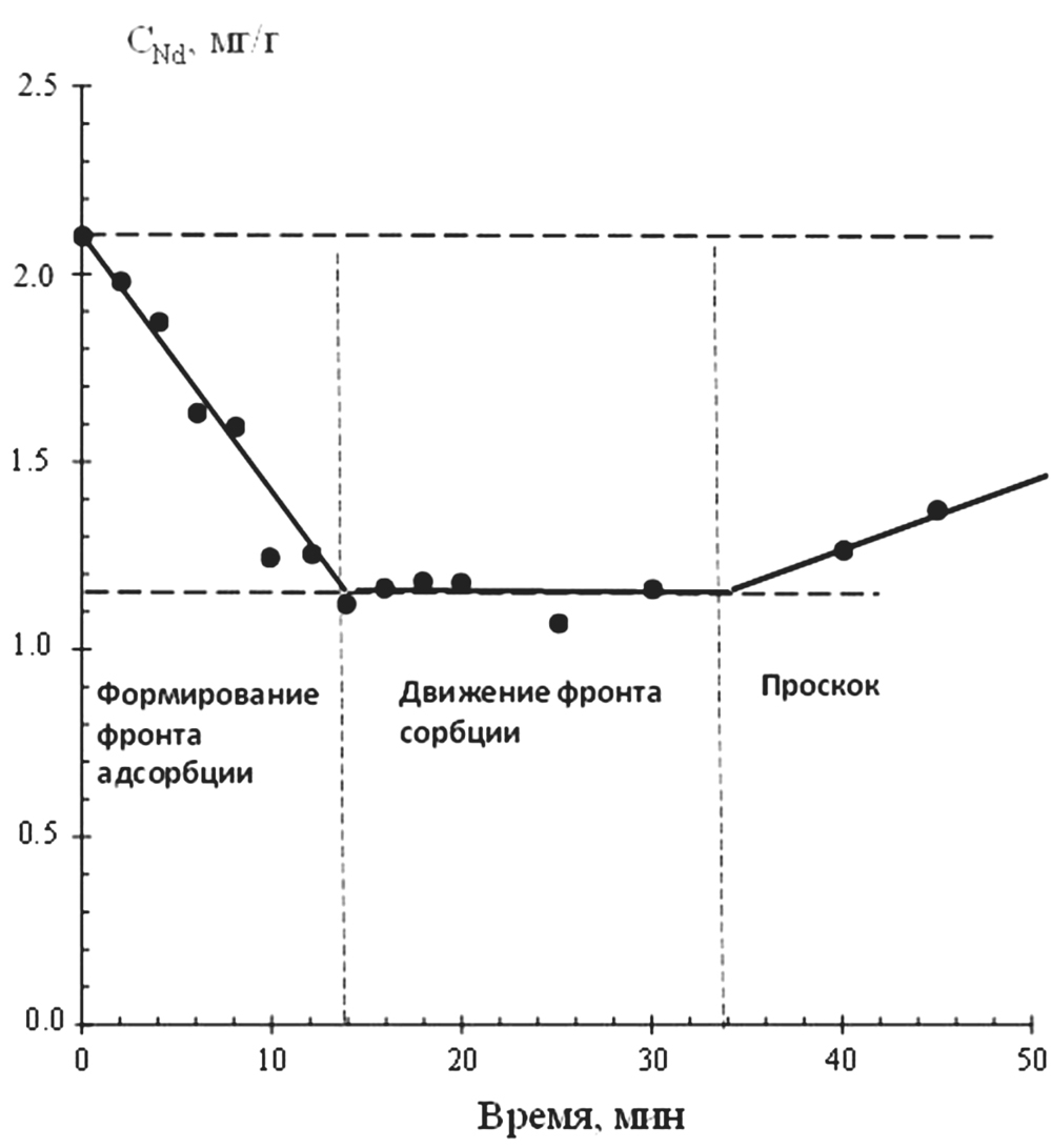 На рис. 2 показана выходная кривая сорбции фторида неодима из расплава после его пропускания через активный уголь. На выходной кривой рис. 2 можно выделить три участка. На первом участке содержание фторида неодима в расплаве снижается с 2.1 (начальная концентрация) до 1.05 мг/г к 12 мин от начала его протекания через сорбент. Первый участок характеризуется линейной зависимостью и, по-видимому, связан с формированием фронта сорбции фторида неодима в слое активного угля. Второй участок характеризуется неизменной концентрацией фторида неодима и, вероятно, связан непосредственно с извлечением фторида неодима из расплава в условиях стационарного движения фронта в глубь сорбента.