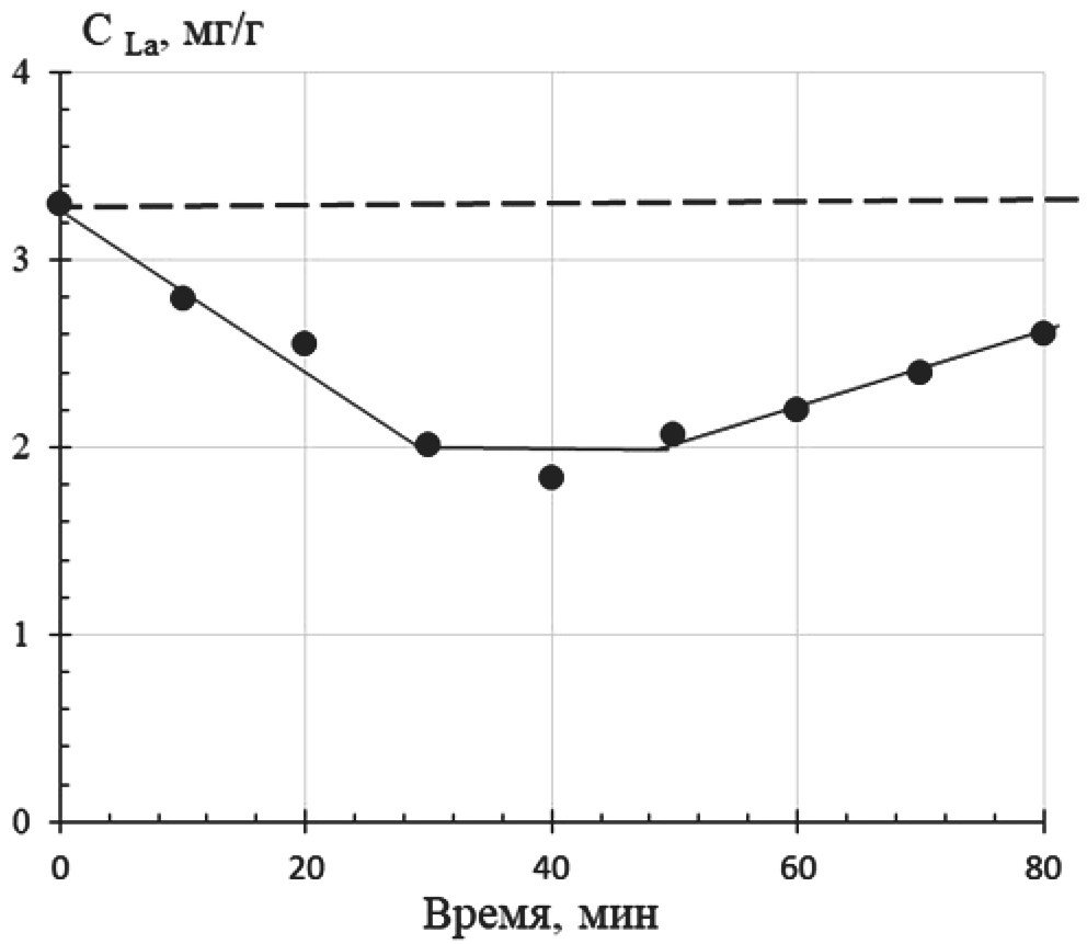 Очевидно, что для повышения степени извлечения фторида лантана из расплава для более высоких концентраций следует увеличить высоту слоя сорбента. При этом, вероятно, уменьшится начальный (первый участок), на котором формируется фронт сорбции, так как для меньшего слоя угля (рис. 3) время формирования стационарного процесса больше почти в 2 раза.