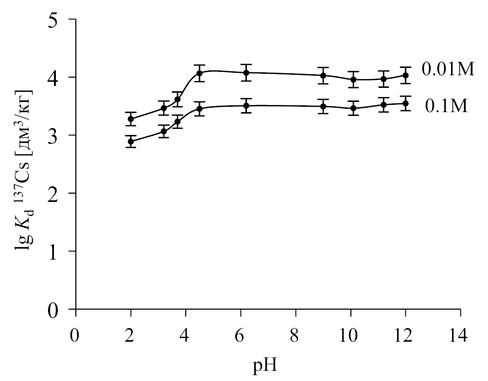 Эксперименты по изучению сорбции 137Cs из растворов проводили методом ограниченного объема при следующих условиях: температура 20 ± 2°С, периодическое перемешивание образца с аликвотой раствора в течение 2 мин каждые 4 ч. Время взаимодействия образца с раствором составляло 72ч, что достаточно для установления сорбционного равновесия в системе образец суглинка–раствор [8]. Исследование сорбции 137Cs образцами суглинков проводили при изменении рН в интервале от 2 до 12. По результатам экспериментов рассчитывали коэффициент распределения (Kd, дм3/кг) цезия по формуле