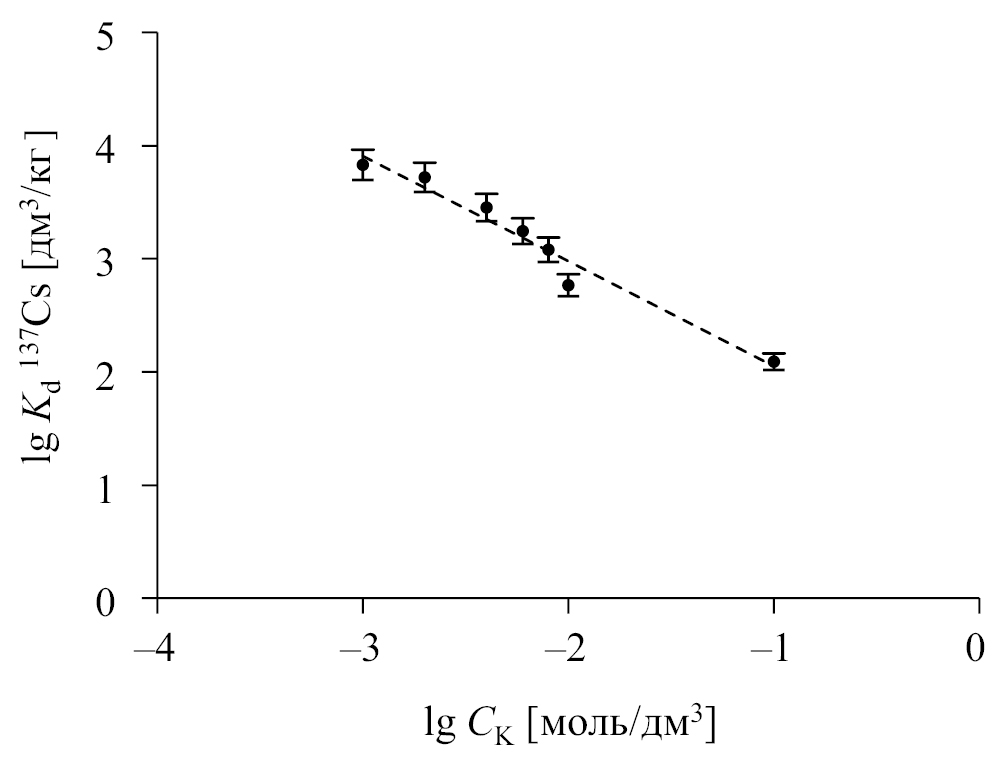 Установлено, что для образца суглинка Ф значения Kd 137Cs закономерно снижаются в интервале от 7.9 × 103 до 1.3 × 102 дм3/кг при увеличении концентрации в растворе конкурирующего с Cs+ катиона K+ от 1 до 100 ммоль/дм3. Полученная на рис. 2 зависимость представляет собой прямую линию, что свидетельствует об ионообменном характере сорбции 137Cs образцом суглинка Ф. Как видно из рис. 2, эффективная сорбция 137Cs (Kd 137Cs > 103 дм3/кг) образцом суглинка Ф наблюдается при концентрации K+ в растворе не более 10 ммоль/дм3.