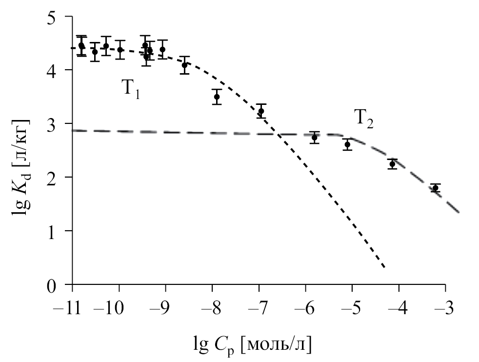 Перегибы на изотерме сорбции Cs (рис. 3) свидетельствуют о том, что образец суглинка Ф имеет два типа сорбционных центров Т1 и Т2, различающихся коэффициентом распределения цезия. При низких концентрациях Cs+ в растворе он сорбируется на центрах Т1, которые по мере роста концентрации Cs в растворе насыщаются, и в сорбции начинают принимать участие центры Т2. Максимальные емкости центров Т1 и Т2 образца суглинка Ф по Cs, определенные с использованием равновесной концентрации Cs в растворе, когда Kd Cs начинает линейно уменьшаться в соответствии с изотермой Ленгмюра по формуле (3), составляют 4.0 × 10–5 и 1.2 × 10–2 моль/кг соответственно, а значения Kd Cs центров Т1 и Т2 различаются в 20 раз и составляют 1.6 × 104 и 7.9 × 102 дм3/кг.