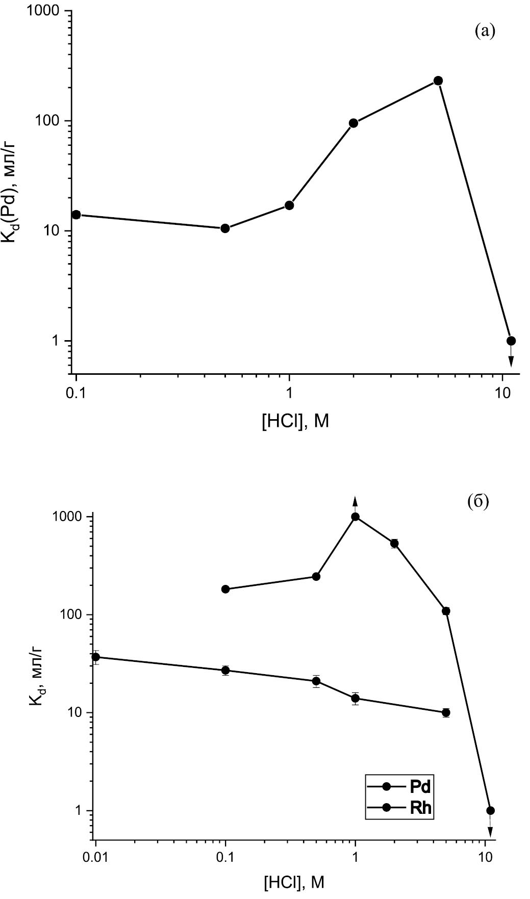 При изучении Kd палладия на DGA (рис. 2а) установлено, что в диапазоне концентраций HCl от 0.1 до 1 М палладий слабо удерживается сорбентом (Kd около 10), но при дальнейшем увеличении концентрации кислоты до 5 М Kd возрастает до значений около 250 и затем снижается до значений ниже 1 в 11 М HCl, что, вероятно, объясняется конкуренцией хлорид-ионов с анионными хлоридными комплексами палладия за связывание с сорбентом.