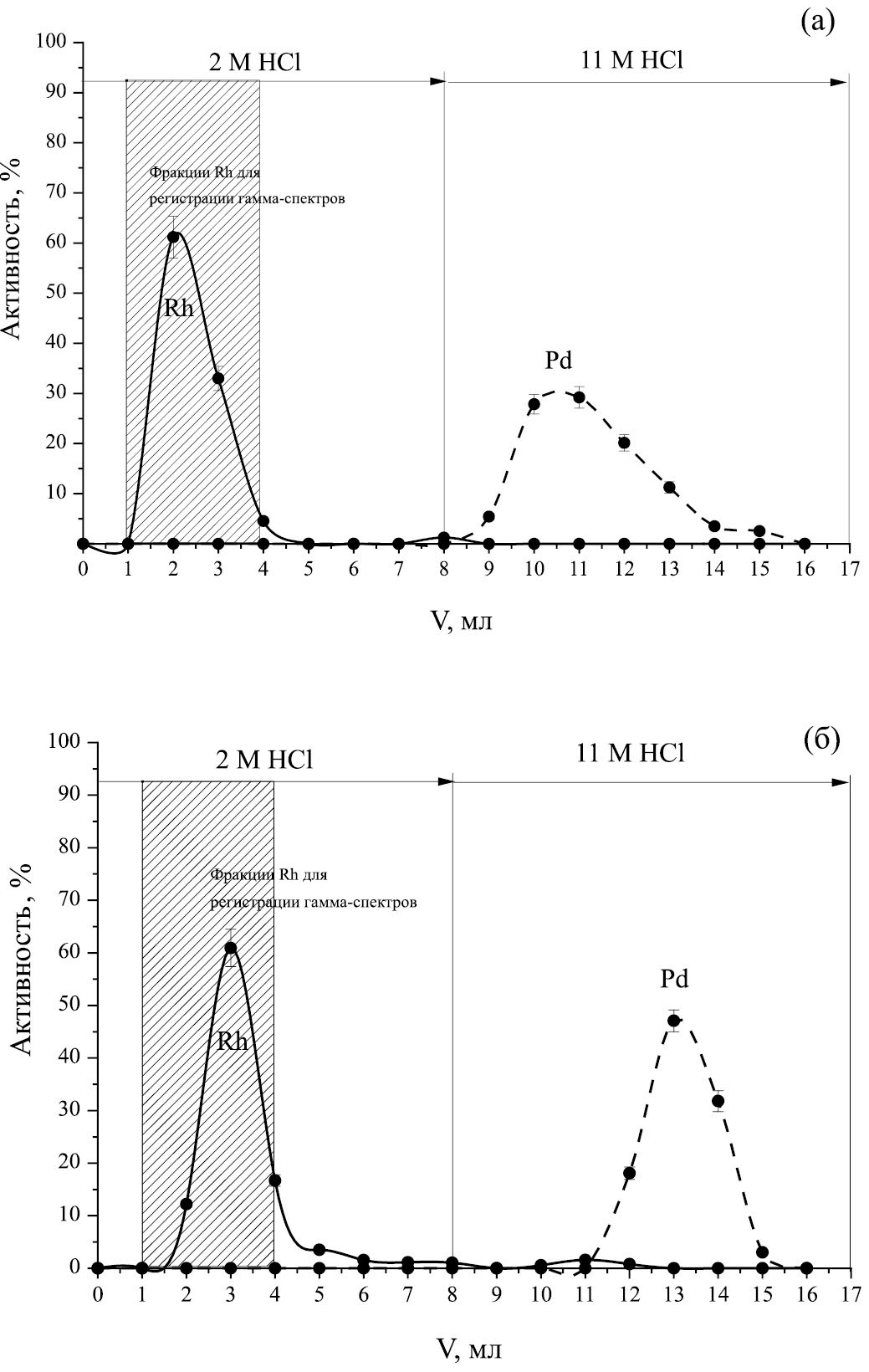 До выделения изотопов родия из облучённого палладия сорбенты предварительно выдерживали в растворе 1 М HCl в течение 1 ч, затем заполняли ими колонку объёмом 3 мл и диаметром 6 мм, промывали колонку 15 мл раствора 2 М HCl, после чего пропускали через неё полученный после облучения и растворения мишени раствор PdCl2 в 2 М HCl. Собирали полученные фракции элюата по 1 мл, определяя содержание родия и палладия методом гамма-спектрометрии.
