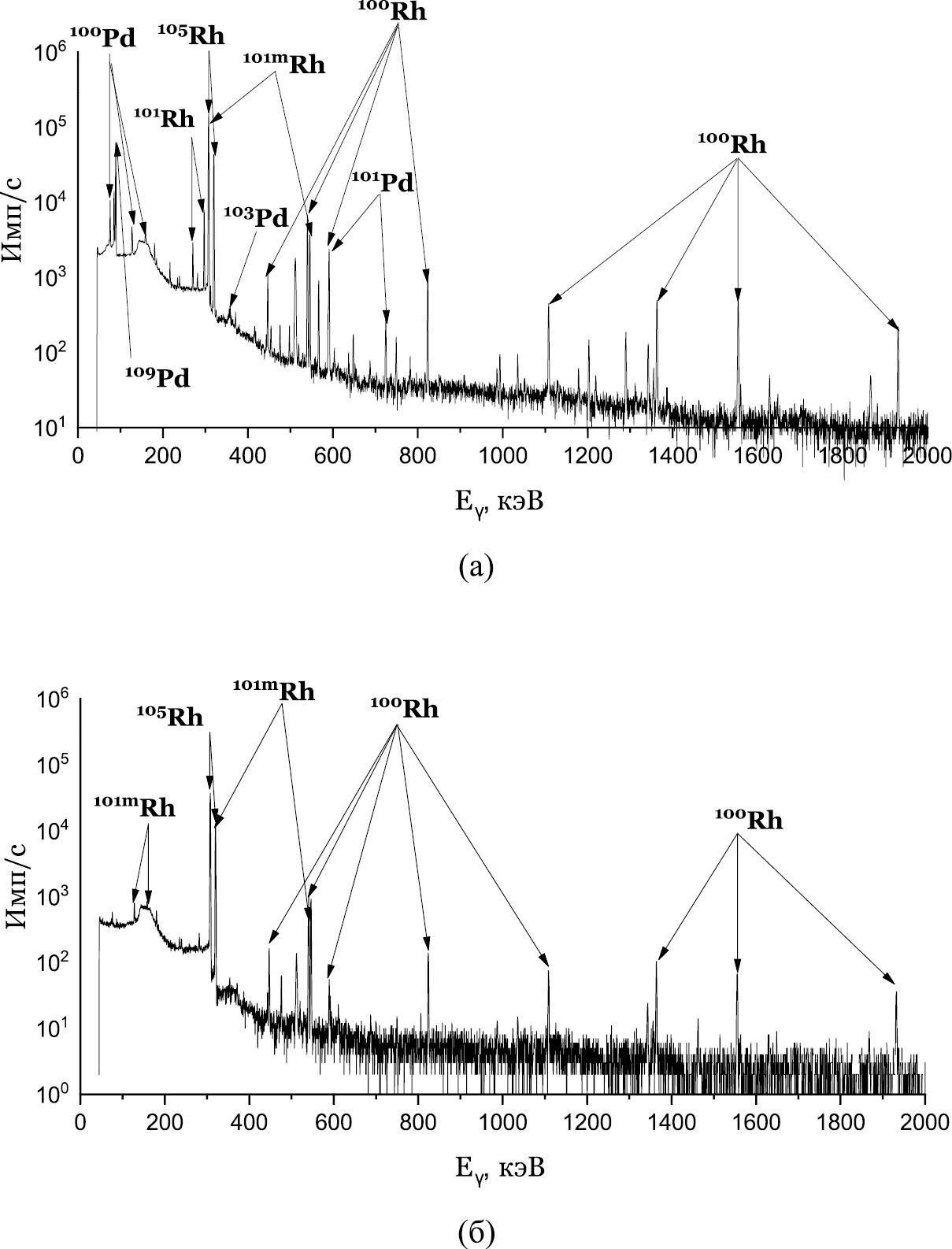 В работе для определения радионуклидного состава облучённого Pd проводили облучение раствора Pd, содержащего также природный изотоп 197Au (монитор тока ускорителя). Раствор для облучения готовили следующим образом. Металлическое золото массой 17,5 мг растворили в царской водке, довели объём раствора в мерной колбе до 50 мл, в результате получив раствор с содержанием золота 0,35 мг/мл. Навеску 270 мг PdCl2 растворяли в 2 мл царской водки в стеклянном стакане, после чего переливали содержимое во флакон с крышкой объемом 5 мл, добавляли 1,14 мл полученного раствора золота и промывали стакан водой, добавляя промывные растворы во флакон. Полученный раствор для облучений содержал 160 мг Pd и 0,4 мг золота. Раствор облучали в течение 42 мин, после чего сразу же проводили регистрацию гамма-спектров с использованием гамма-спектрометра с детектором из высокочистого германия GC3019 (Canberra Ind, США). Идентификацию максимума пика в спектрах осуществляли с помощью разработанной нами автоматической системы регистрации и анализа спектров. В базу данных сохранялись спектры длительностью по 3.5 с каждый, а система анализа позволяла их суммировать и отображать суммарный спектр заданной длительности [30]. Прошедший заряд вычисляли, используя известное сечение реакции 197Au(γ, n)196Au, что позволило затем определить активности всех идентифицированных изотопов на момент конца облучения.