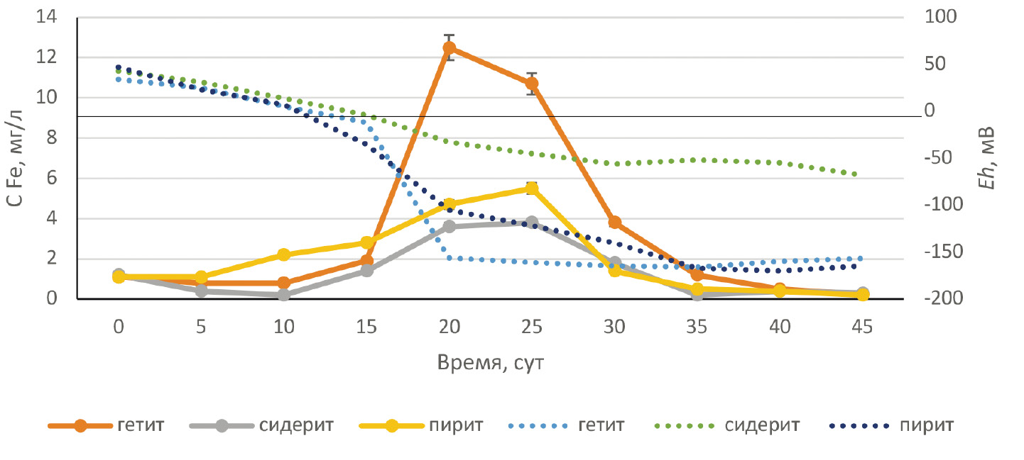 Анализ процесса выщелачивания железа из минералов (рис. 4) показывает, что наиболее активно выщелачивание железа происходит из образца гетита к 20-м суткам, когда значения Eh установились на уровне –150 мВ за счет активности анаэробных железовосстанавливающих бактерий. При этом на 25-е сутки и далее содержание железа в растворе стало резко снижаться, несмотря на восстановительные условия. Это, по нашему мнению, свидетельствует об образовании вторичных аутигенных железистых минеральных фаз. Для системы с сидеритом, где микробная активность была значительно ниже, снижение редокс-потенциала системы протекало не так значительно.
