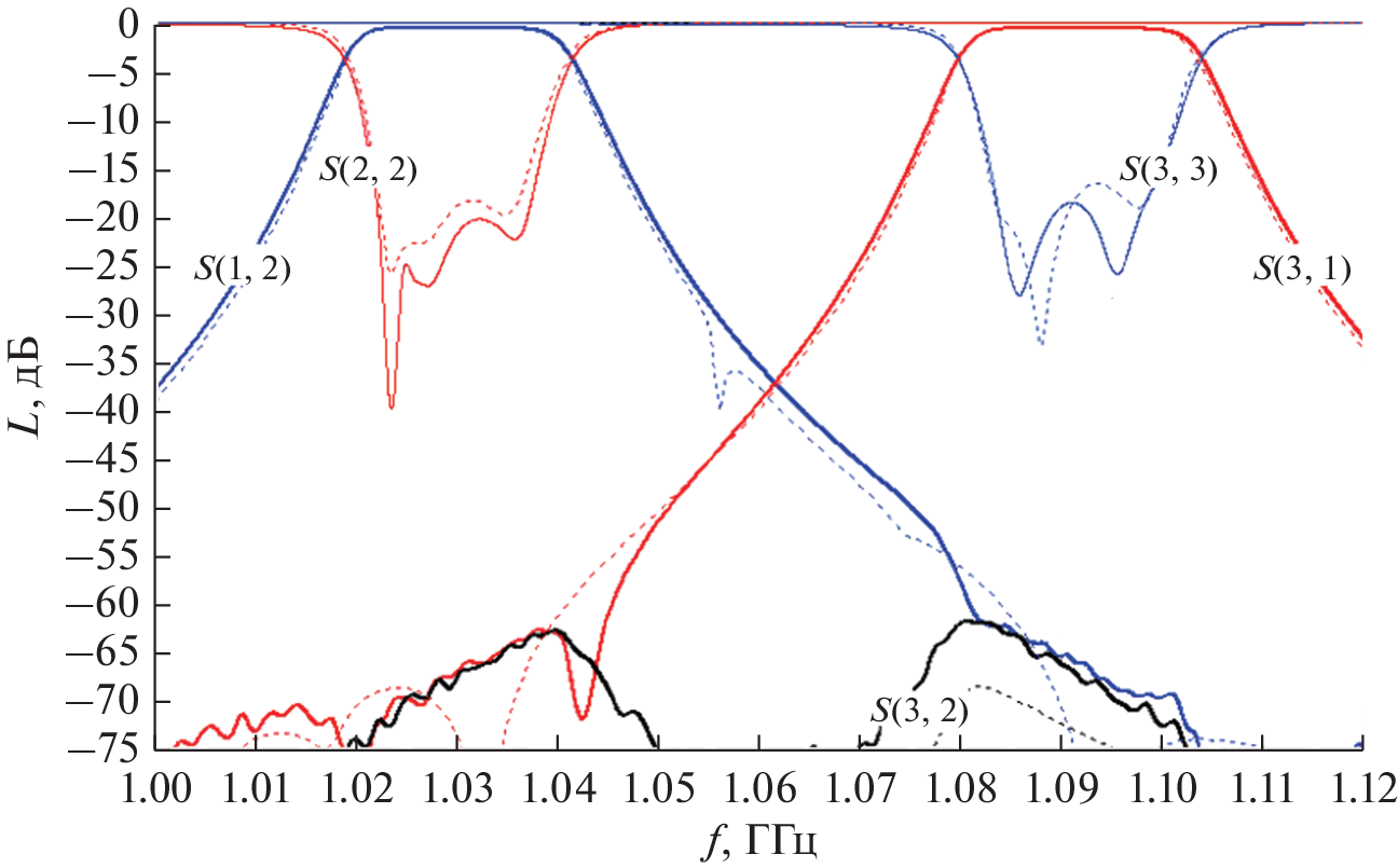 A frequency-separating device (FSD) with low insertion losses has been developed that provides electrical strength at high input power and combines the functions of several typical elements of the feeder path of a secondary surveillance radar (SSR): a receive/transmit switch, a harmonic filter, and a receiving band-pass filter. The issues of synthesis, analysis, and optimization of filters for the receiving and transmitting channels of the FSD are considered. Two options for the implementation of an FSD with insertion loss in the channel bandwidths within 0.7 dB, a harmonic suppression level of more than 40 dB, channel isolation, and attenuation at a deviation of ±60 MHz from the center frequencies of the passbands of at least 50 dB are proposed, the devices operate at frequencies of the FSD and of the seventh range of SSR systems with input pulse power up to 12 kW. The main dimensions of the FSD design, the results of numerical simulation, and the data of experimental verification of the characteristics are given. A comparative analysis of theoretical and experimental results is given.