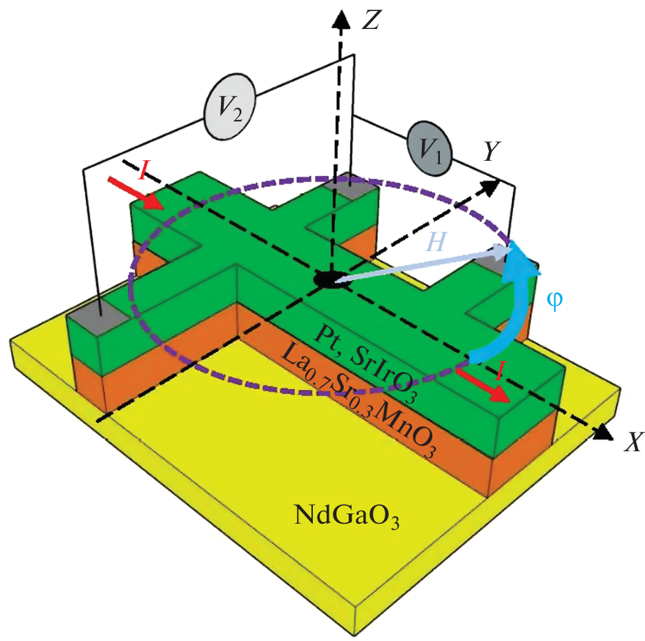 Представлены результаты экспериментального определения спинового угла Холла в двухслойной структуре металл/ферромагнетик Pt/La0.7Sr0.3MnO3, полученные из угловых зависимостей продольного и поперечного спинового магнетосопротивления в конфигурации планарного эффекта Холла. Определенная из продольного магнетосопротивления величина спинового угла Холла составила θHx ≈ 0.016, а из поперечного θHy ≈ 0.018, в то время как для гетероструктур SrIrO3/La0.7Sr0.3MnO3 отношение величин поперечного спинового угла Холла к продольному оказалось значительно выше, θHy/θHx ≈ 9, что вызвано, скорее всего, образованием слоя с высокой проводимостью на границе SrIrO3/La0.7Sr0.3MnO3.