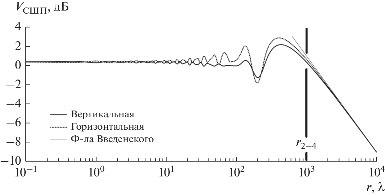 Исследованы особенности распространения сверхширокополосной волны над поверхностью Земли в двухлучевой модели. Показано, что существует предельное расстояние (точка срыва), до которого сверхширокополосная волна затухает примерно как в свободном пространстве с показателем затухания n = 2, не испытывая замираний, благодаря крайне малому времени автокорреляции сверхширокополосной волны; за точкой срыва показатель затухания волны становится равным n = 4.