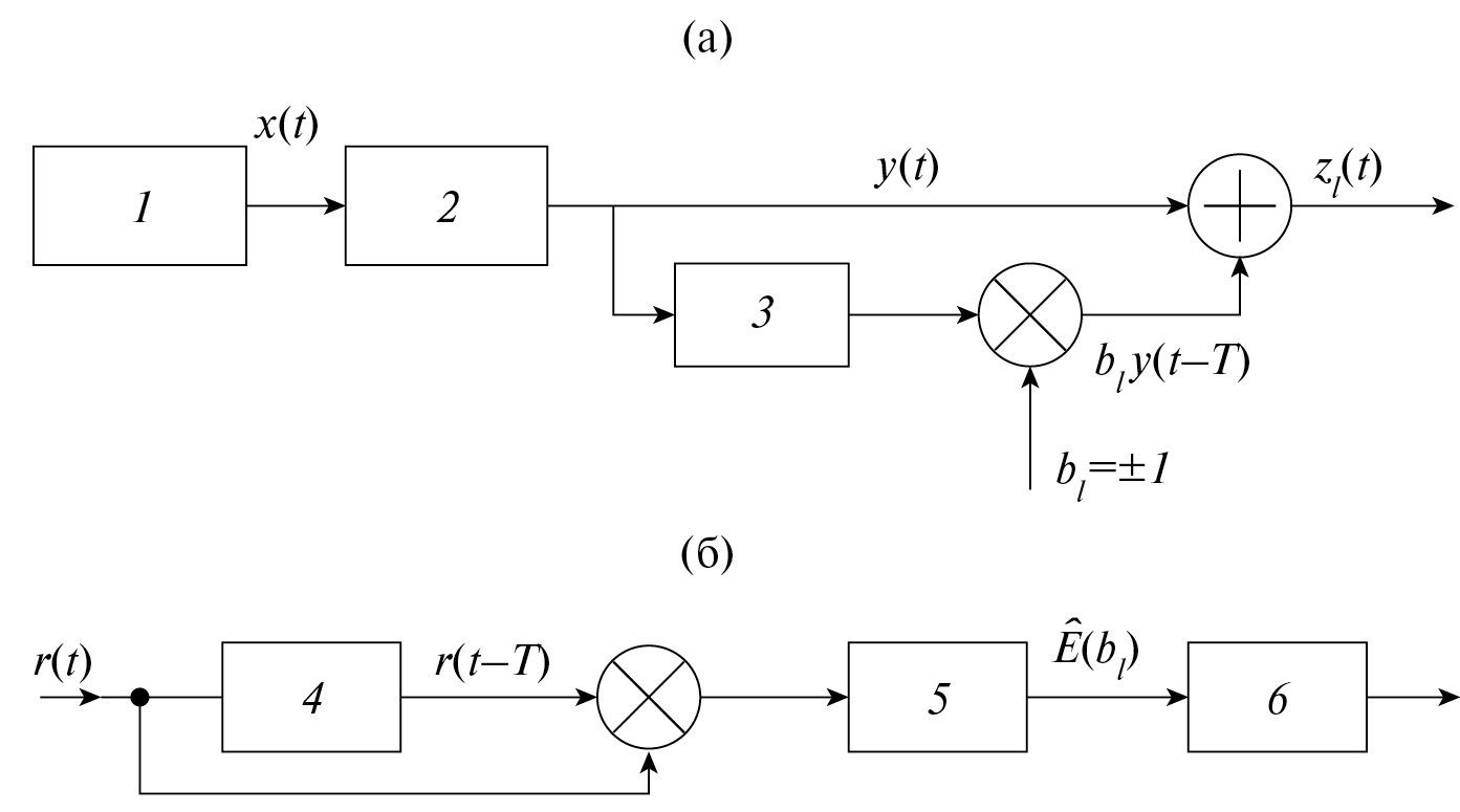 С выхода полосового фильтра в передатчике несущий сигнал y(t) разделяется на информационный и опорный каналы (см. рис. 1а). В информационном канале шумовой сигнал y(t) задерживается линией задержки 3 на время Т = 6 нс, которое превышает время его когерентности τc = 1 нс. Задержанный сигнал умножается на противоположные значения bₗ = ±1 информационных символов с номерами l = 1, 2, 3, …, N и поступает в виде на вход сумматора, на другой вход которого следует опорный сигнал y(t). В линейном сумматоре происходит суперпозиция между опорным сигналом и задержанным информационным сигналом в виде
