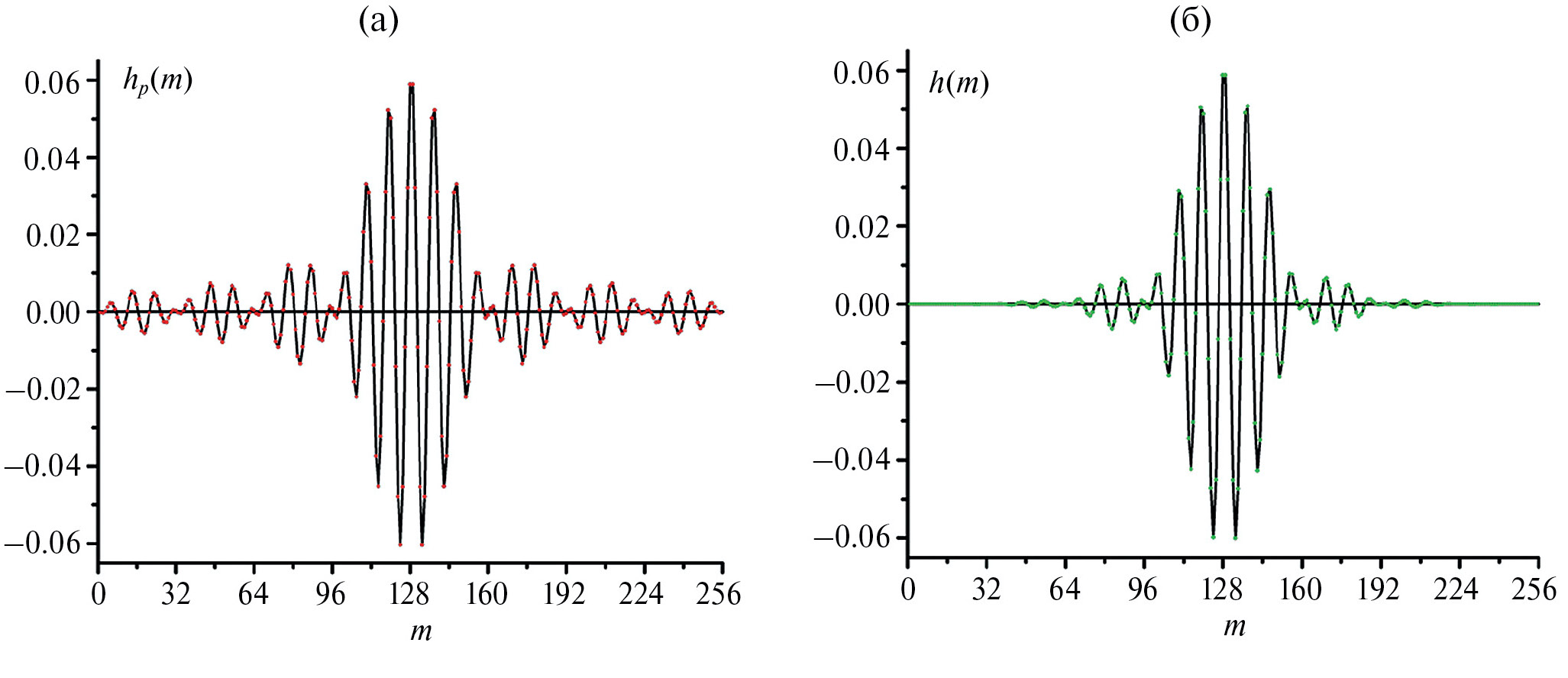 где Fн = fнd, Fв = fв d– нижняя и верхняя нормированные частоты в полосе пропускания фильтра. На рис. 4а представлен график ядра hp(m) из М = 256 дискретных отсчетов с высокими боковыми выбросами во временной области.