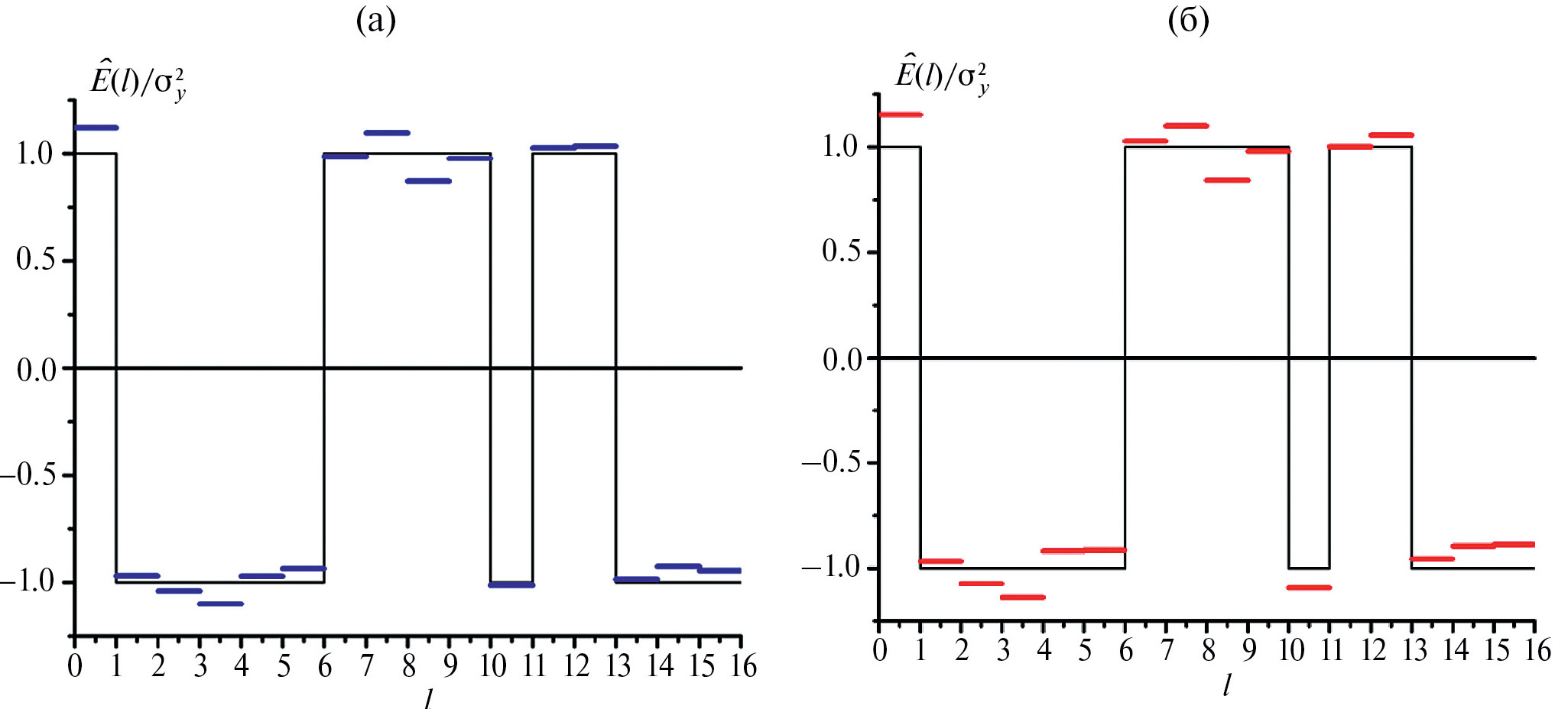 Рис. 5. Флуктуации корреляционных оценок (жирные линии) относительно истинных значений в потоке битов bₗ = ±1 при отсутствии (а) и при воздействии (б) внешних помех q = 1; l – номер бита.