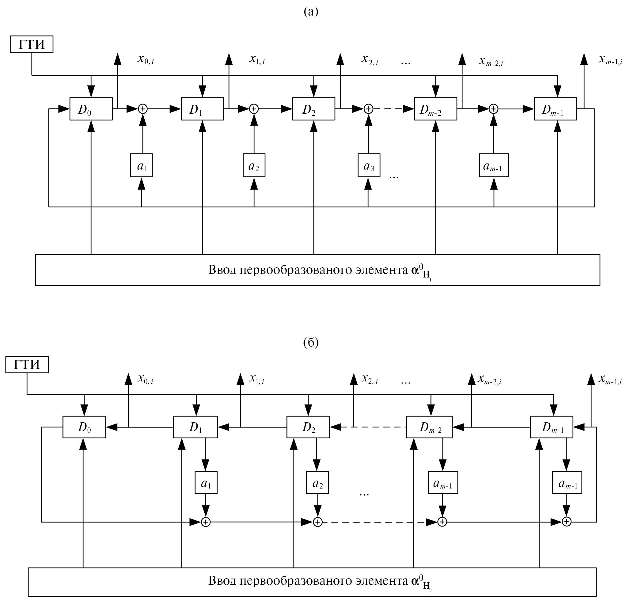 Рис. 1. Генераторы мультипликативных групп 1 (а) и 2 (б) поля Галуа по модулю неприводимого примитивного полинома с коэффициентами a0, a1,..., am–2,am–1; ГТИ – генератор тактовых импульсов.