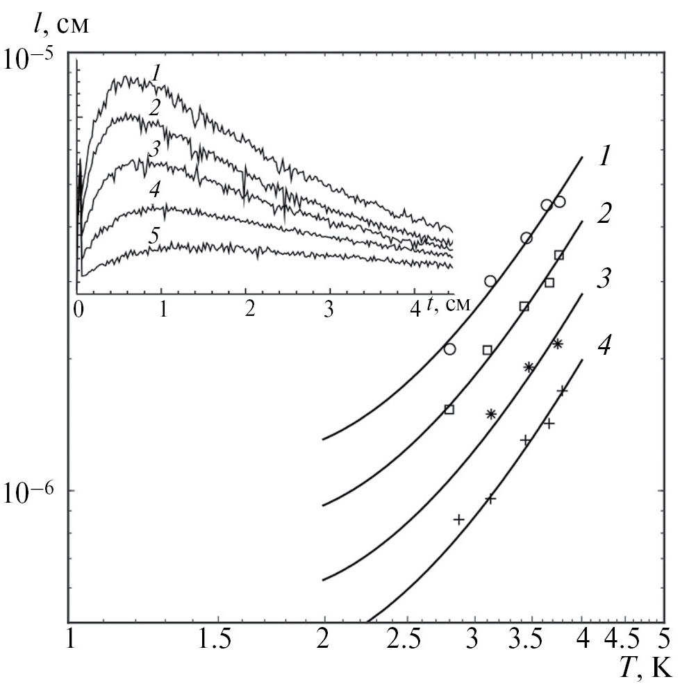 Рис. 1. Зависимость l от температуры для образцов одного размера (R ≈ 200 нм) с различным содержанием примеси: х = 0.091 (1), 0.126 (2), 0.20 (3) и 0.30 (4); сплошными линиями изображены расчетные теоретические зависимости. На вставке – регистрируемые сигналы в образце керамики ТЭ состава Ce0.909Gd0.091O2–y при различных температурах термостата: T = 3.76 (1), 3.64 (2), 3.44 (3), 3.13 (4) и 2.81 K (5).