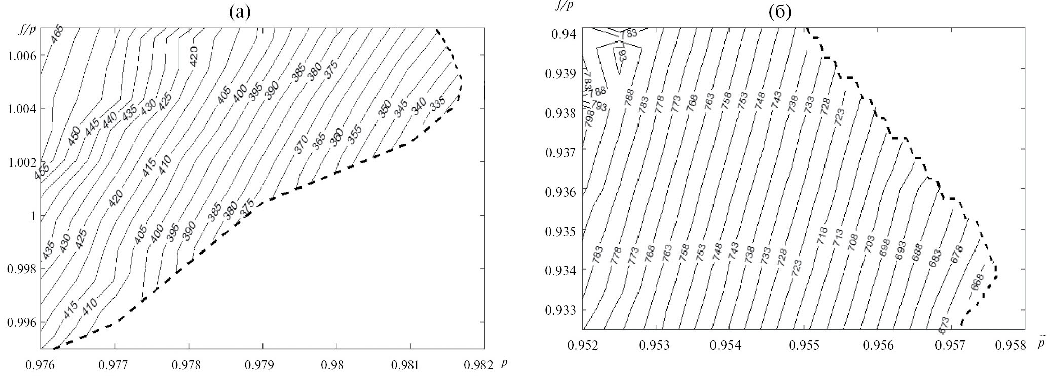 Рис. 4. Линии уровня величины 106 σ в зависимости от параметров p и f/p: (а) — угол зрения 40° (x0 = 0.15, d = 1), (б) — угол зрения 65° (x0 = 0.205, d = 1).