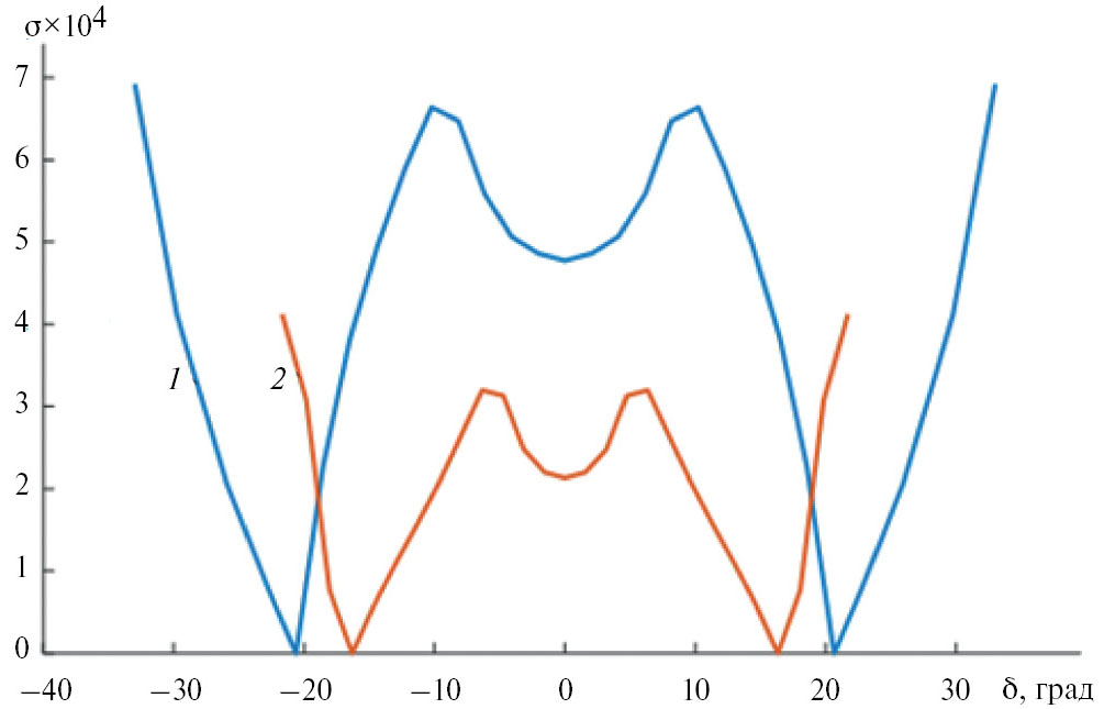 Рис. 5. Зависимость величины 104σ оптимальных бифокальных систем от угла зрения: x0 = 0.205, f/p = 0.9334, p = 0.9575 (кривая 1); x0 = 0.15, f/p = 1.0043, p = 0.9815 (кривая 2).
