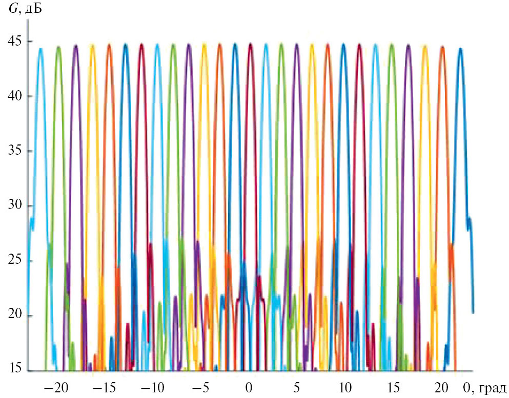 Как видно из рис. 8, в угловом секторе 40° уровень боковых лепестков диаграммы направленности лучей ниже — 15.8 дБ, а величина КИП выше уровня 0.84 в полосе частот от 18 до 30 ГГц.