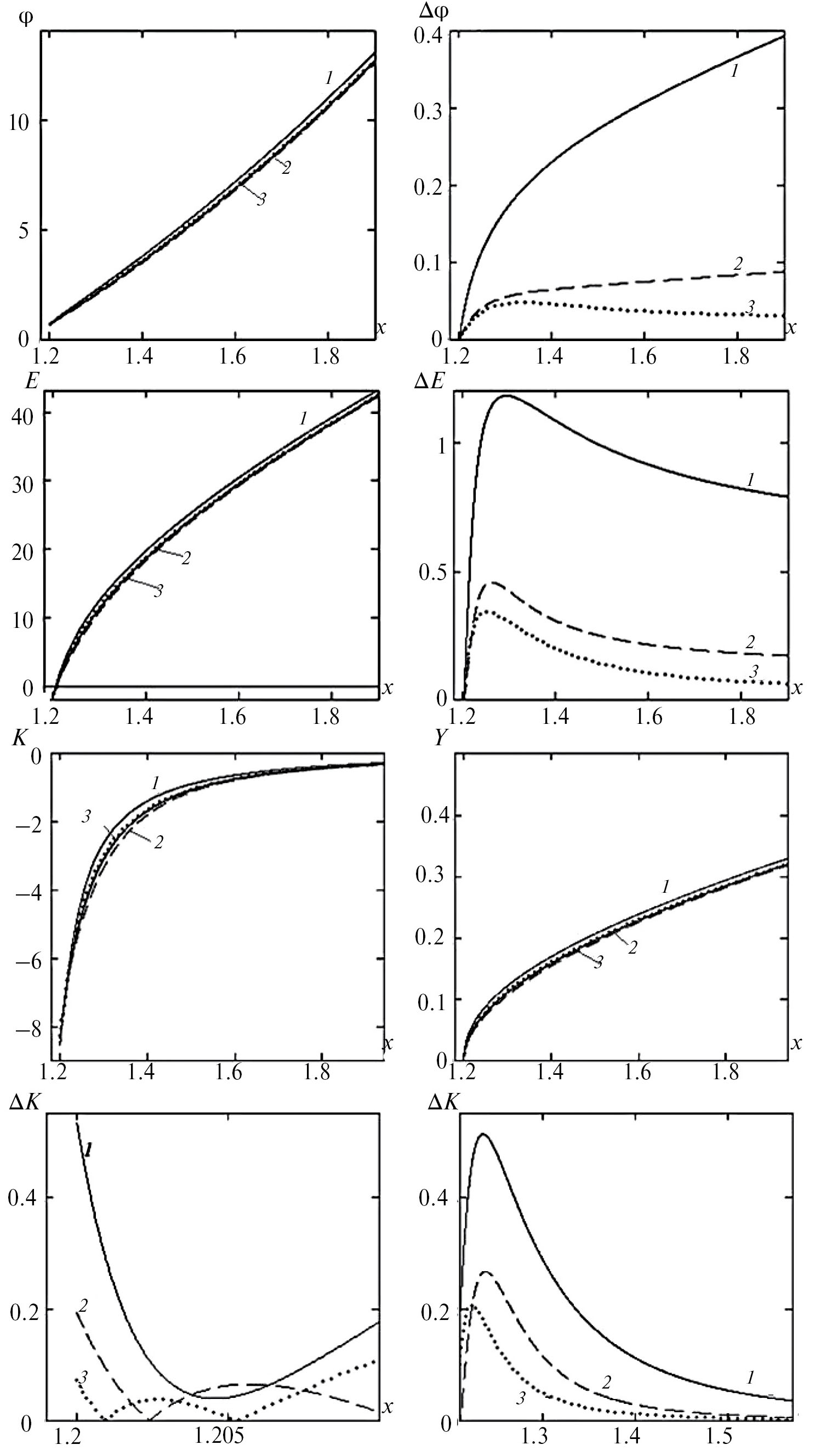 Точность вычисления кривизны границы является весьма жестким критерием. В трех последних вариантах (59) при указанных значениях потенциал и поле определяются с ошибками 0.59, 2.9 %; 0.22, 5.9 %; 0.007, 3.9 %, а отклонение приближенной траектории от точной составляет 2…3 %.