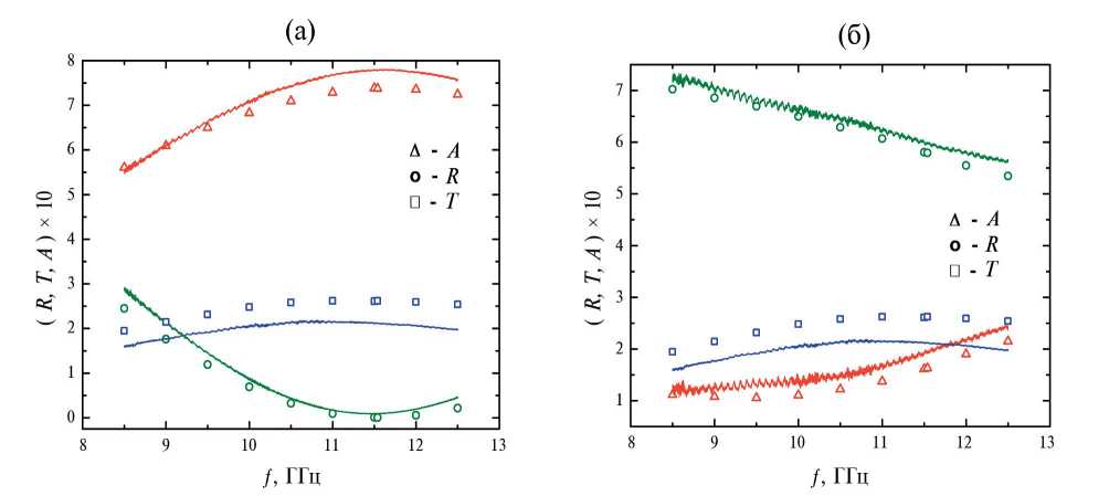 Рис. 1. Частотные зависимости микроволновых коэффициентов R, T и A медной пленки для двух геометрий падения волны: падение волны со стороны подложки (а) и падение волны со стороны пленки (б); символы – коэффициенты медной пленки толщиной 7.9 нм, напыленной непосредственно на подложку из кварцевого стекла, сплошные кривые – значения аналогичных коэффициентов для Cu-пленки такой же толщины, но выращенной на германиевом подслое.
