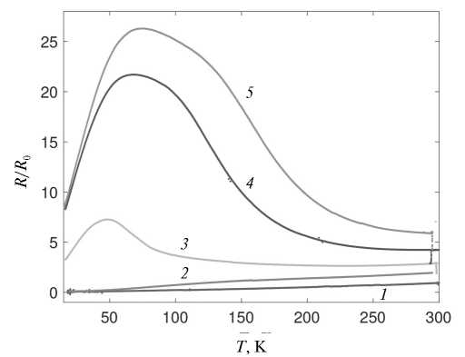 Дальнейшее увеличение деформации растяжения позволило нам наблюдать максимум на кривой R(T)/R0, который с ростом ε уменьшается по амплитуде и сдвигается в область высоких температур (см. рис. 4, кривые 1–3).