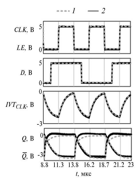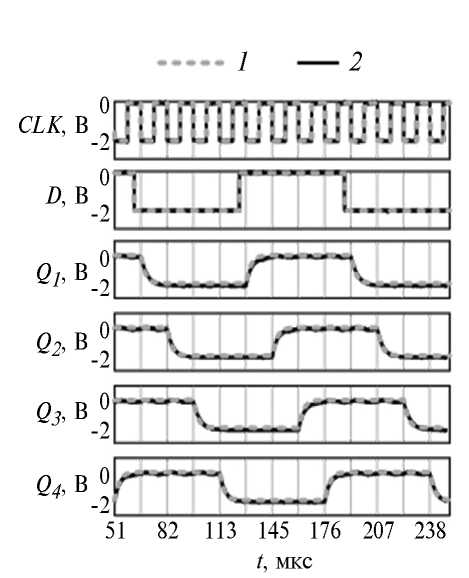 Рис. 9. Характеристики четырехразрядного регистра сдвига: 1 – моделирование; 2 – измерение.