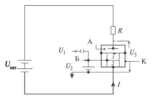 Рис. 1. Схема параметрического автоэмиссионного устройства на двух пьезоэлементах 1 и 2, размеры которых меняют расстояние между катодом K и анодом А; Б – база (затвор), U1 – переменное напряжение, поступающее на базу и меняющее размеры пьезоэлементов, U2 – напряжение, определяющее первоначальные размеры пьезоэлементов, Uпит – напряжение источника питания, U3 – меняющееся напряжение на приборе, I – ток, идущий через прибор.