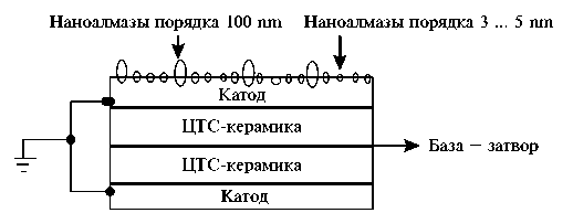 На основе патента [2] были разработаны схемы (рис. 1–3), показывающие возможность создать такой прибор с более высокой (мегаваттной) выходной мощностью. Для усиления поля между катодом и анодом было использовано отрицательное электронное сродство наноалмазов.