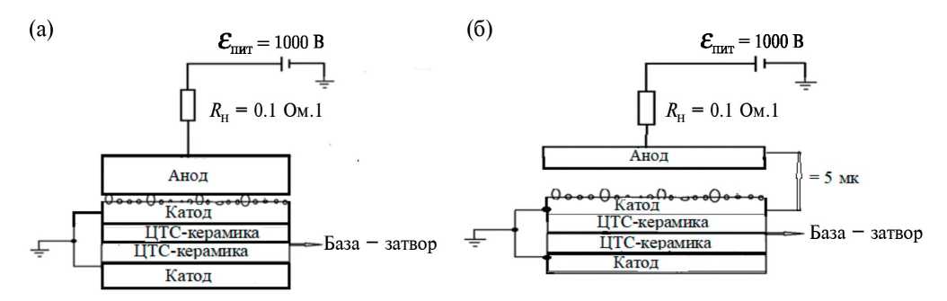 Рис. 3. Конструкция прибора в режимах: а – насыщения, Rп = 10–7 Ом, б – отсечки, Rп = 105 Ом.