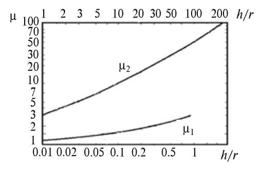Рис. 5. Зависимость коэффициента усиления напряженности поля µ от отношения h/r [6]: 1.4…3 для μ1, 3…100 для μ2.