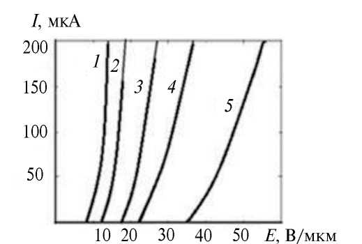 Рис. 6. Зависимость величины эмиссионного тока от напряженности электрического поля для различных расстояний между электродами диодной структуры: 60 (1), 30 (2), 15 (3), 10 (4) и 5 мкм (5) [7, рис. 6].