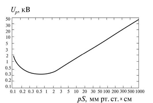 Еще одной проблемой, связанной с изменением расстояния катод–анод, является пробой промежутка. Из кривой Пашена следует (рис. 7), что, увеличивая расстояние, чтобы не было пробоя, нужно уменьшать давление.