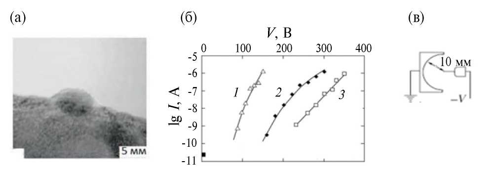 Рис. 8. Одиночная, изолированная, прочно связанная наноточка детонационного алмаза на кончике иглы (а) и характеристики автоэлектронной эмиссии (б): с пленки наноалмаза (1), с голого молибденового наконечника (2), с изолированной частицы наноалмаза (3), а также схема экспериментальной установки (в) [9, рис. 2].