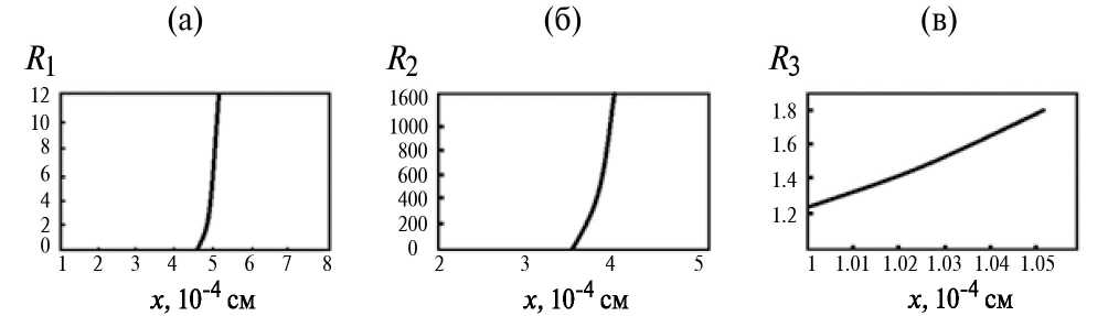 Рис. 9. Зависимость сопротивления R прибора от расстояния x катод–анод: а) R = R1 ×105 Ом, б) R = R2 × 1 Ом, в) R = R3 ×10–6 Ом; Uпит = 1000 В, коэффициент усиления поля 10 (расчет по формуле Фаулера–Нордгейма).