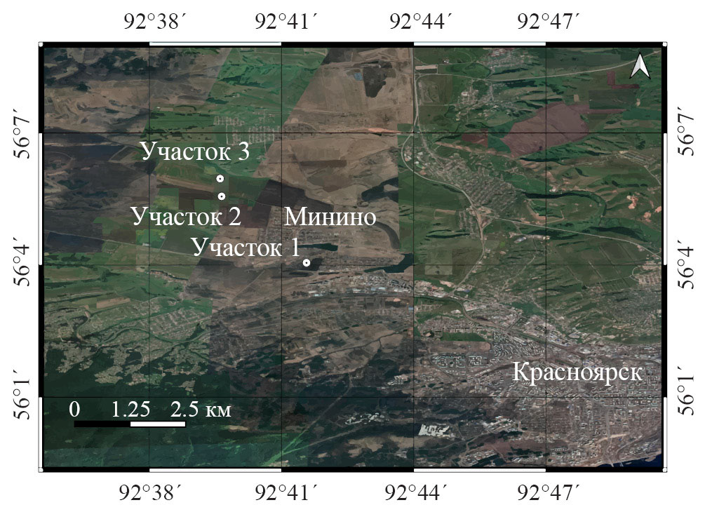 Рис. 1. Расположение тестовых участков в районе пос. Минино: координаты участка 1 — 56.0644 с.ш., 92.6967 в.д.; участка 2 — 56.0888 с.ш., 92.6660 в.д.; участка 3 — 56.0951 с.ш., 92.6654 в.д.