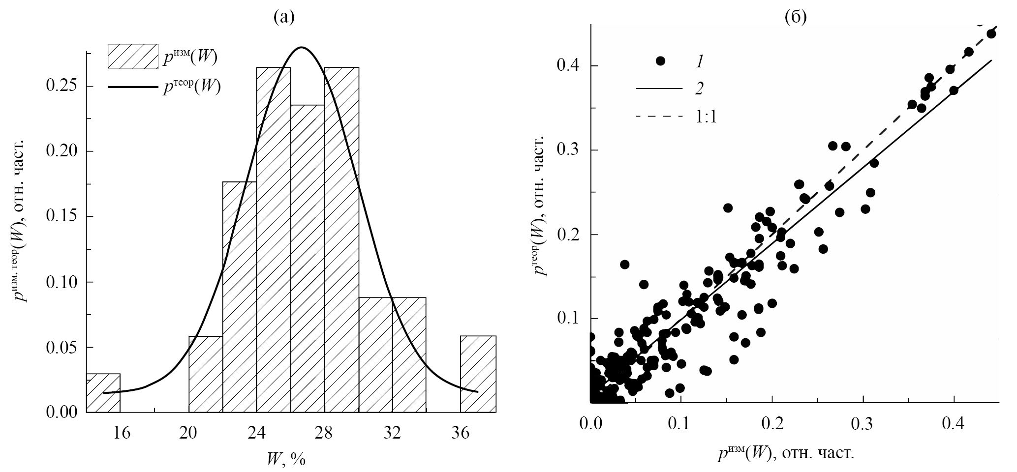 Рис. 7. Распределение значений объемной влажности почвы: а) измеренных 21.09.2022 pизм(W) на тестовом участке 2, площадка 1 при R2 = 0.869, pтеор(W) – соответствующая аппроксимация гауссовой функцией; б) корреляция между измеренными и аппроксимированными (гауссова функция) распределениями W для всех тестовых участков в ходе всех экспериментов (1), линейная регрессия (2) при R2 = 0.895.