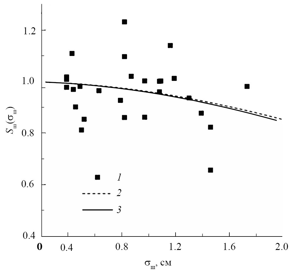 Модель (4) фактора шероховатости Sш(σш) удовлетворительно описывает соответствующие измеренные значения (рис. 11, кривая 3). В силу того, что в формуле (4) в фактор шероховатости не входят свободные параметры для оптимизации, на рис. 11 для сравнения приведена также функция распределения Гаусса (кривая 2), аппроксимирующая экспериментальные зависимости (1) со СКО = 0.11. Видно, что зависимость, аппроксимирующая экспериментальные данные (рис 11, кривая 2), практически совпадает с моделью (4) фактора шероховатости (кривая 3), что дополнительно указывает на справедливость применения закономерности (4) для фактора шероховатости Sш(σш).