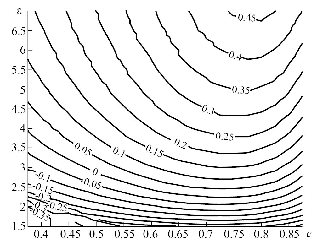 На рис. 4 приведены линии постоянного уровня величины (fкр — fm)/fm на плоскости переменных ε, с, рассчитанные с использованием дисперсионных уравнений (1), (2).
