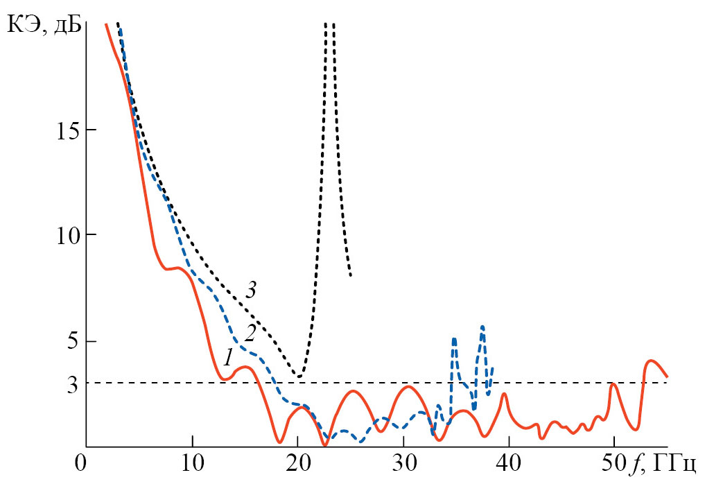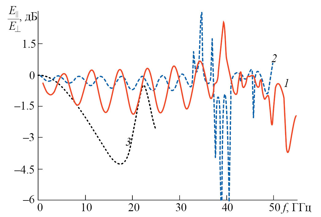 Как видно из рисунка, нижняя частота fн, на которой КЭ = –3 дБ в работе [5] отсутствует, так как КЭ > 3 дБ на всех частотах, в работе [9] fн =18 ГГц, а в данной работе fн =16.34 ГГц. Верхния частота диапазона fв = 34.63 ГГц в работе [9] , а в данной работе fв = 49.92 ГГц. Таким образом, данные, полученные для поляризаторов в [5, 9], и наши результаты расчета КЭ для тех же параметров поляризатора, не совпадают.