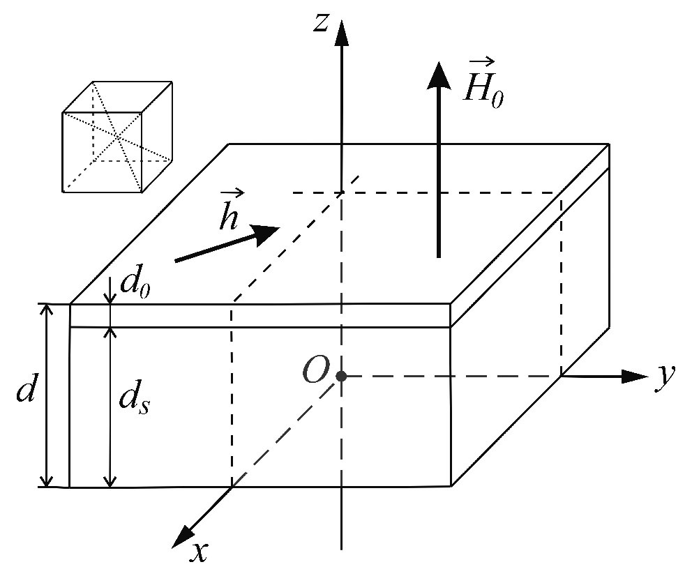 Основу данной геометрии составляет структура, которая состоит из пленки толщиной d0 и подложки толщиной ds. Их суммарная толщина равна d, выполняется условие . Пленка имеет магнитные, упругие и магнитоупругие свойства, а подложка является немагнитной, упругие и кристаллографические свойства которой близки по значению к соответствующим значениям пленки, и поэтому в расчетах считаются одинаковыми. Вся структура имеет кубическую кристаллографическую симметрию, плоскость (100) которой совпадает с плоскостью пластины. Внешнее постоянное магнитное поле направлено перпендикулярно плоскости пленки, а переменное магнитное поле лежит в ее плоскости. Плоскость Oxy декартовой системы координат совпадает с плоскостью пластины, а оси координат параллельны ребрам куба кристаллографической ячейки. Центр O системы координат лежит на нижней плоскости структуры.