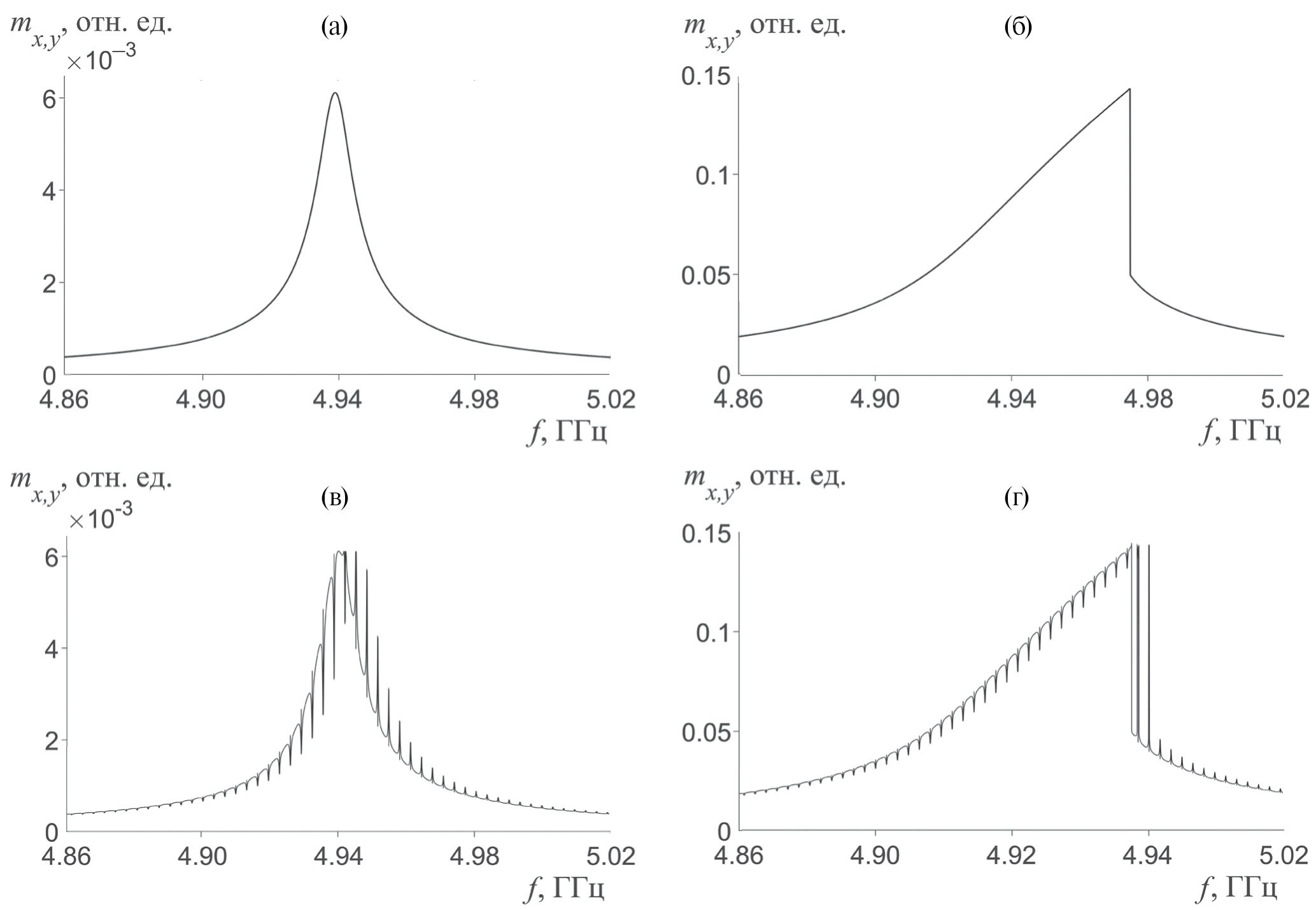 На рис. 7 показана АЧХ при удвоенном значении параметра B2 по сравнению со значением, при котором рассчитаны АЧХ на рис. 2. Можно заметить, что в нелинейном режиме, кроме увеличения амплитуды резонансносвязанных линий, увеличивается также значение частоты срыва колебаний (рис. 7б). На рис. 8 показан вид одной резонансносвязанной линии при различных значениях параметра магнитоупругой связи B2 слева от центра ФМР в линейном (рис. 8а, 8в) и нелинейном (рис. 8б, 8г) режимах. На рис. 8в, 8г эта кривая резонанса показана вблизи его центра. При усилении магнитоупругой связи увеличивается амплитуда резонансных линий, но уменьшается их ширина, поскольку увеличивается добротность упруго связанной резонансной системы, хотя данный факт не является очевидным.