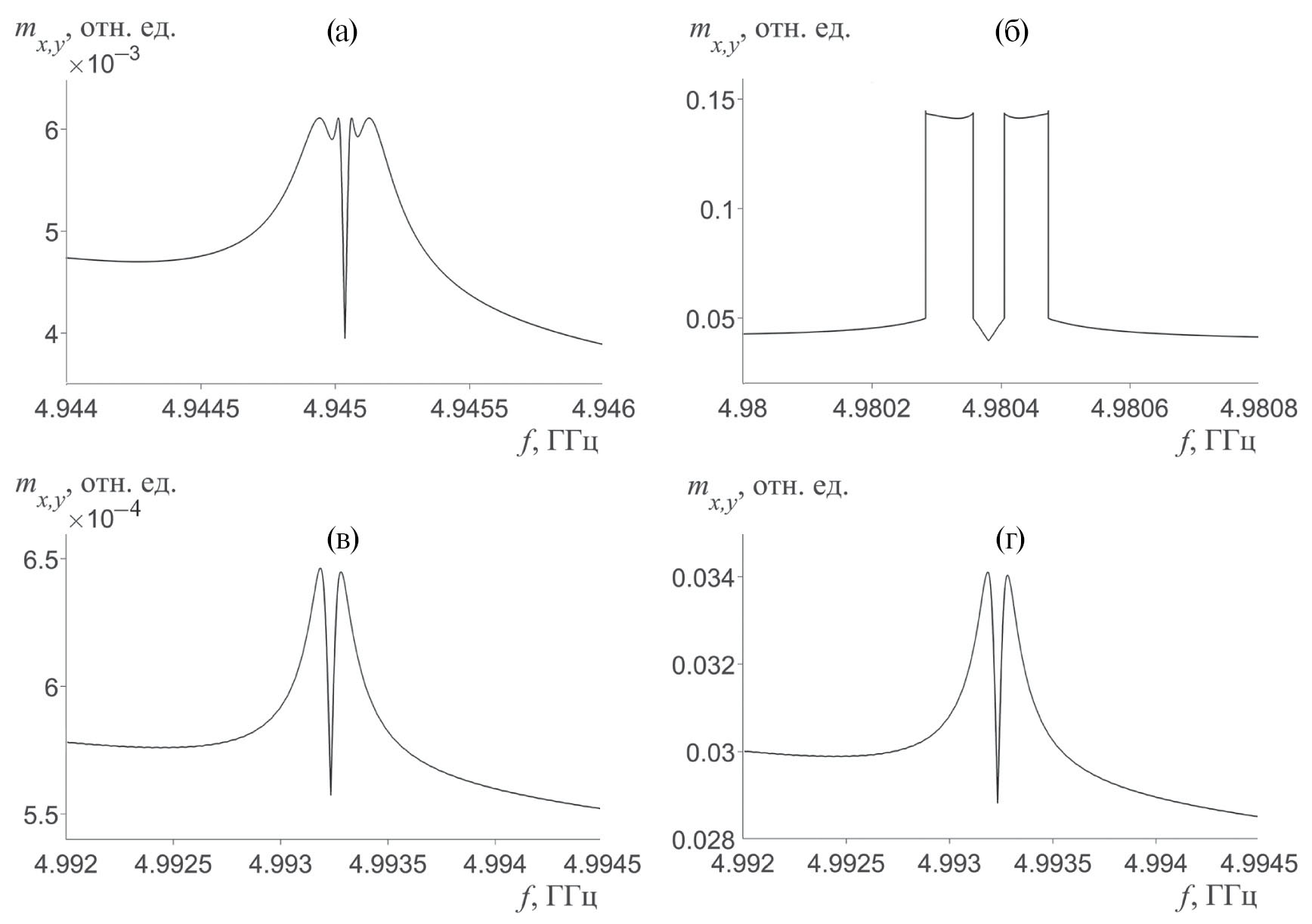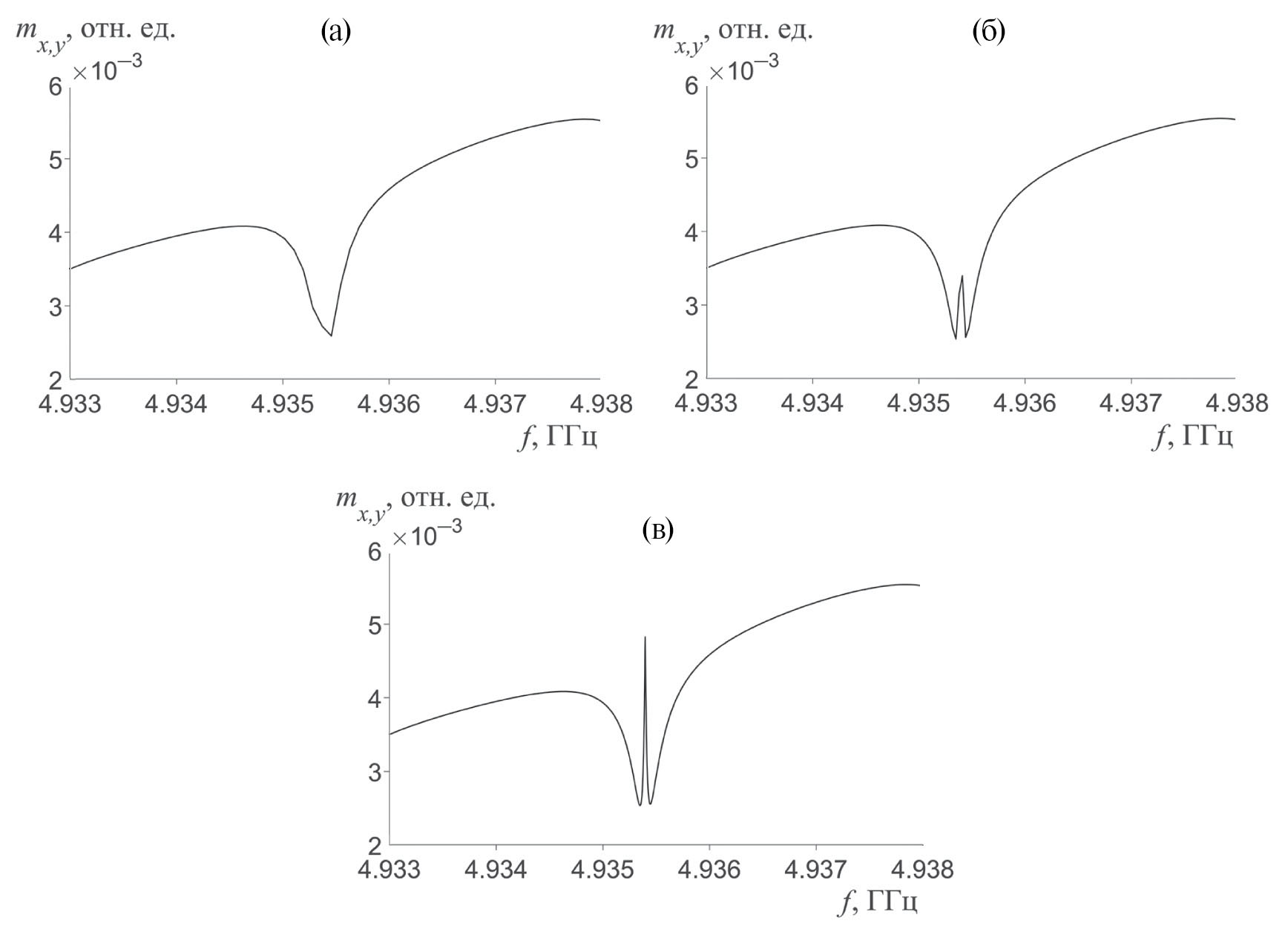 На рис. 4 представлены формы резонансной линии при различных шагах расчета, хорошо согласующиеся с данными работы [12, рис. 1]. При малом шаге видно, что резонансные линии расщепляются (рис. 4в). При недостаточно малом шаге и в силу очень малой ширины линий это расщепление может иметь вид, показанный на рис. 4а, 4б. Расстояние между двумя линиями, которое соответствует соседним полумодам, равно 3.5 МГц, что в точности совпадает с данными работы [23, рис. 4], где указано расстояние между двумя соседними резонансными модами, равное 7 МГц.